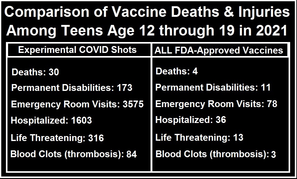 CDC: Teens Injected with COVID Shots have 7.5 X More Deaths, 15 X More Disabilities, 44 X More Hospitalizations than All FDA Approved Vaccines in 2021