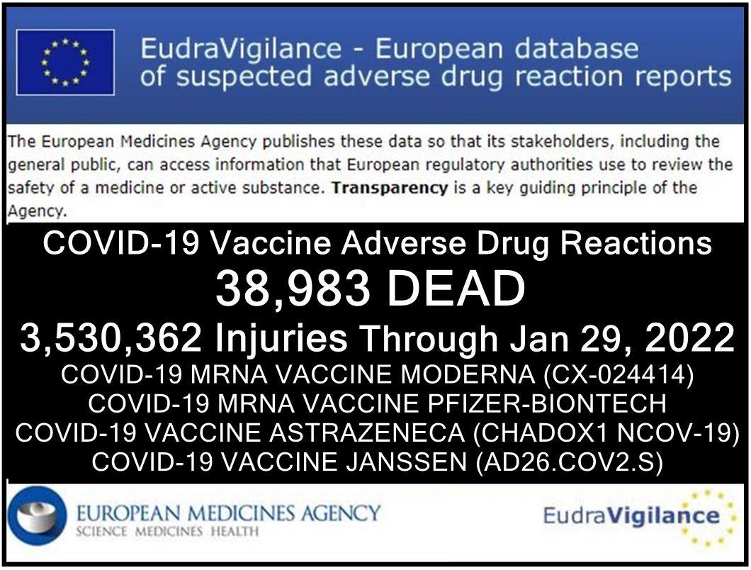 The European (EEA and non-EEA countries) database of suspected drug reaction reports is EudraVigilance, verified by the European Medicines Agency (EMA), and they are now reporting 38,983 fatalities, and 3,530,362 injuries following injections of four experimental COVID-19 shots: